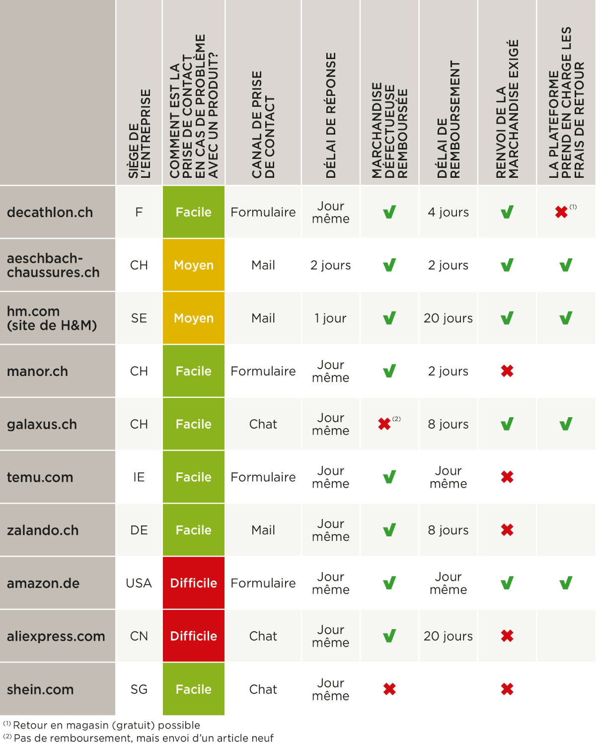 En cas de problème, l’acheteur doit pouvoir facilement s’adresser au service client. Pour vérifier que c’est bien le cas, nous avons simulé une tong cassée quelques semaines après l’achat. Dans plus de la moitié des plateformes, la prise de contact s’est avérée facile: les entreprises fournissent le lien direct vers le service client dans l’e-mail de confirmation d’achat. Il est ainsi facile à trouver et à utiliser en cas de réclamation. Pour H&M et Aeschbach, nous n’avons pas trouvé de marche à suivre facilitée, mais nous avons écrit un e-mail au service client.
