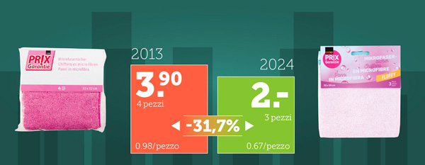 En une dizaine d’années, le marché des chiffons en microfibres a cessé la surenchère. Le rayon s’est restreint, alors qu’avant, chaque usage spécifique nécessitait un carré dédié à la tâche. Salle de bains, lunettes, téléviseur, salon, poussière, cuisine, verres, vitres, vaisselle, inox, sols et universels se répartissaient le travail. Le Prix Garantie de Coop, meilleur rapport qualité/prix de l’époque, existe toujours, mais cette fois en deux versions: Fluffy et Shiny. Son prix a évolué à la baisse de 30 centimes la pièce, mais il est un peu plus petit, passant de 32 x 32 cm à 30 x 30 cm. Soit une perte de surface de 12% l’unité.