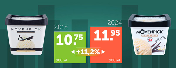En 2015, nous avions mesuré le pourcentage d’air contenu dans des glaces, parmi les rares denrées vendues au volume et non au poids. Il ressortait que certaines contenaient plus de 50% d’air. «Cela améliore la texture», avait justifié un fabricant. La Mövenpick, avec un taux d’air élevé et une composition parmi les plus complexes (15 ingrédients!), avait reçu une mauvaise note. Pourtant, son prix en faisait un produit haut de gamme. Aujourd’hui, il coûte plus cher et sa composition a changé: bye-bye les protéines de lait et le sirop de sucre caramélisé, le concentré de pomme est remplacé par un concentré de carotte. À ce prix-là, on s’attendait à mieux.