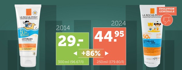 En 2014, nous avons testé la résistance à l’eau de dix protections solaires pour enfant. La crème La Roche-Posay obtenait une bonne note sur les critères composition et efficacité. En revanche, la protection après le bain diminuait clairement, ce qui avait valu, au final, une cinquième place au produit. Il y a dix ans, le tube avait coûté 29 francs pour 300 ml en pharmacie. Désormais, il est à 44 fr. 95 pour 250 ml. Une sacrée augmentation que les nouvelles caractéristiques et allégations (lotion hydratante, «multirésistant», «PA++++» et «antioxidativ») ont de la peine à justifier, même si sa composition reste sans ingrédients à risque.