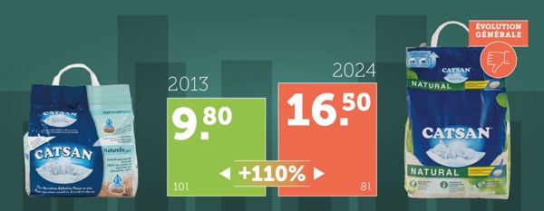 En 2013, la FRC a testé la litière pour chat. Le laboratoire avait mesuré l’absorption de l’humidité, puis des particuliers avaient évalué la facilité d’utilisation, l’acceptation par le chat et les odeurs. La Catsan, sur la 3e marche du podium, était la plus chère du panel. Onze ans plus tard, les gammes se sont diversifiées, mais la Catsan est toujours en rayon et son prix a bondi de 110%. Le sac est passé de 98 centimes à 2 fr. 06/l, tandis que son volume a perdu 2 litres. On notera toutefois que les marques concurrentes sont aussi plus chères, mais dans une moindre mesure.