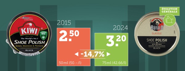 En neuf ans, le rayon cirage a été métamorphosé. Le gagnant de notre test de 2015, le cirage noir Kiwi (acheté chez Coop et dans d’autres enseignes), a été remplacé par une nouvelle marque qui n’existait pas à l’époque, Bufalo. Pourtant, il avait tout pour plaire, il était sans silicone et était le moins cher des produits évalués. Son remplaçant affiche les mêmes qualités à un prix moindre. Le Bufalo Shoe Polish noir coûte 42 fr. 66 le litre, soit 3 fr. 20 les 75ml. Une baisse de prix bienvenue et qui n’offre pas d’excuse pour ne pas soigner ses chaussures en cuir et accroître leur longévité. Tant que les consommateurs voudront bien entretenir leur cuir! Il se murmure que les baskets finiront par avoir raison de la fabrication et la commercialisation de ce produit.